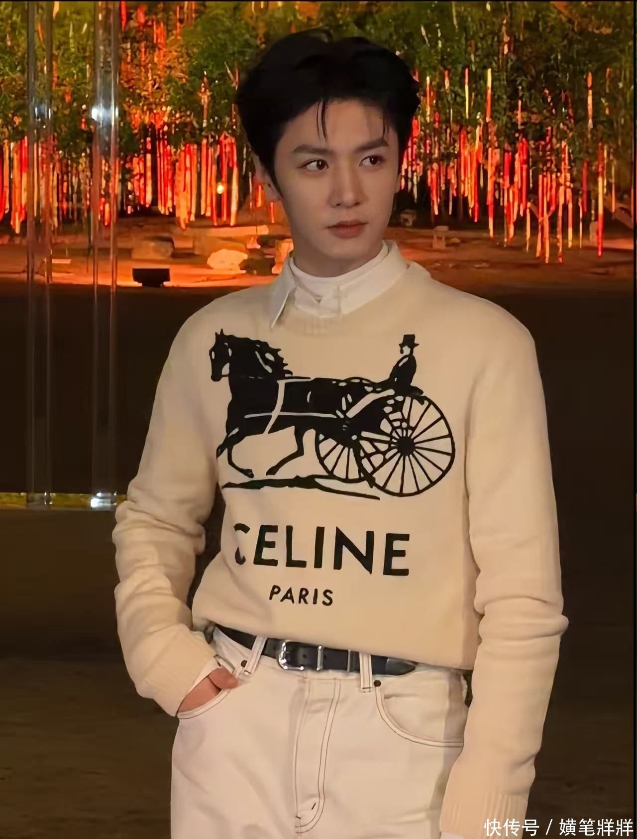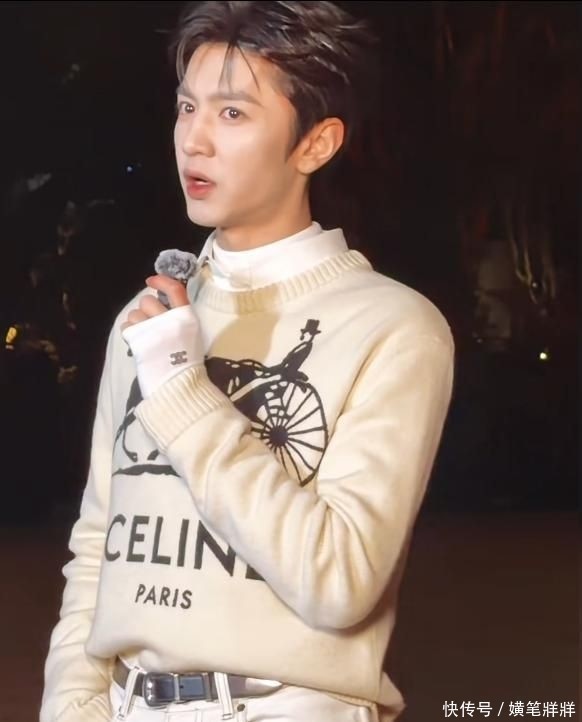16. 他身着CELINE定制白色针织毛衣,配合同款高腰直筒长裤,整体造型干净清爽,与其本身自带的少年气质完美契合。