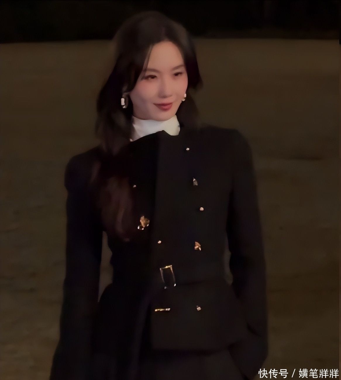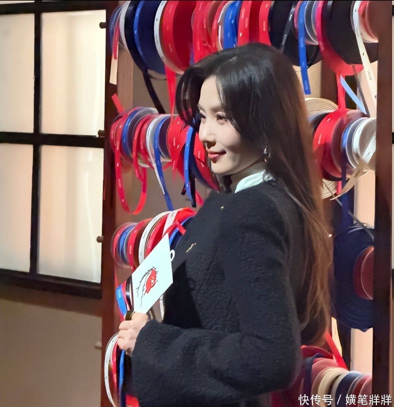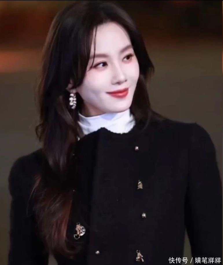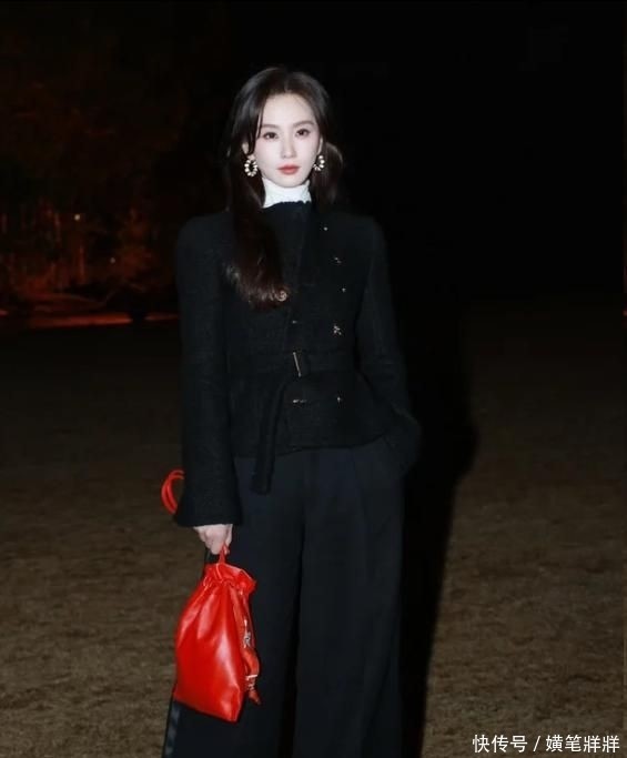 7. 她选择了一件剪裁利落的黑色短款夹克,搭配同色系垂感阔腿长裤,乌黑长发自然披散于肩头,未施繁复装饰,仅凭清晰立体的面部轮廓与挺拔优雅的体态,甫一现身便牢牢锁定所有镜头焦点。