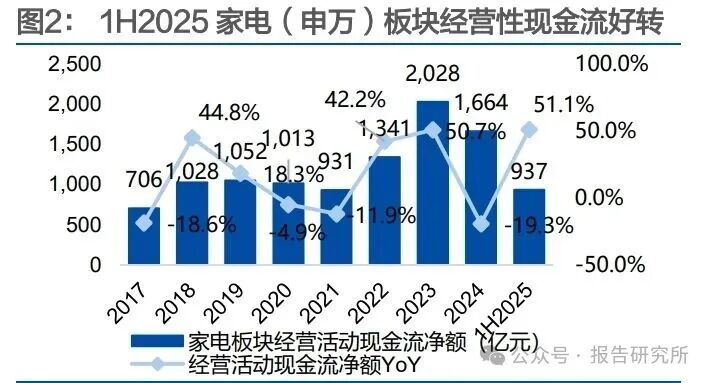 板块营收及净利润双增,经营性现金流有所好转。1H2025 家用电器(申万)板 块整体营收/归母净利润分别达 8685/703 亿元,同比+8.4%/+12.9%,行业收 入增速较 23 年有所回升,且 2022 年以来利润增速持续跑赢收入。盈利能力方 面,1H2025 家用电器(申万)板块毛利率/归母净利率分别为 24.1%/8.1%,分 别同比-1.4/ +0.2pct。现金流方面,1H2025 板块经营活动现金流净额达 937 亿元,同比+51.1%,相较 1H2024 现金流状况有所好转。