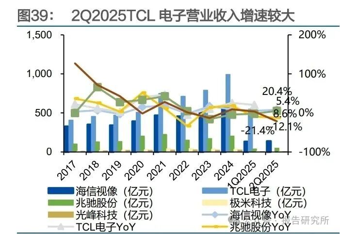 报表端,黑电板块 2Q2025 营收整体同比+1.8%(不考虑 TCL 电子,下同), 增速总体较为稳定;归母净利润同比下滑 9.0%,降幅较 1Q2025 的-1.1%有所 扩 大。 其 中 ,海 信 视 像 增 幅 较 高 , 单 二 季 度 营 收/归 母 净 利 润 分 别 同 比 +8.6%/+36.8%,增速领跑行业。